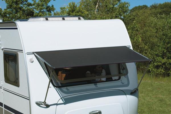 Wohnwagen Fenstermarkise mit Sonnenfilter, welches die Sonneneinstrahlung abhält, jedoch freie Aussicht von innen gewährt. Die Konstruktion des Gestänges ist sehr einfach und passt zu fast allen Wohnwagen.