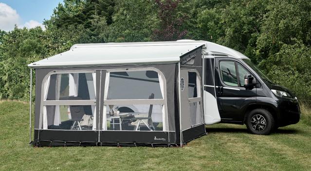 Asortyment przedsionków marki Ventura, specjalnie zaprojektowanych do użytku z kamperami lub samochodami kempingowymi, można szybko rozłożyć i złożyć, a kiedy kamper odjeżdża, przedsionek może pozostać na miejscu i być zamknięty.