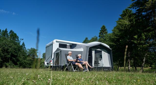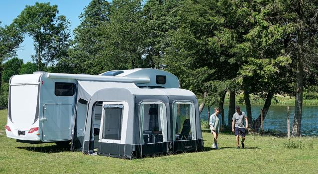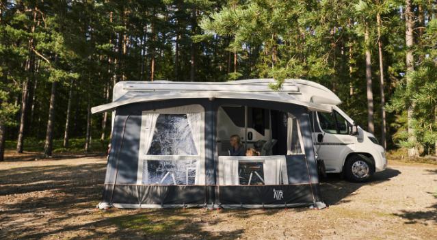 Elastyczna nadmuchiwana markiza kempingowa w dwóch rozmiarach do przyczep kempingowych. Idealny wybór dla osób szukających łatwego rozwiązania do wakacji na kempingu.
