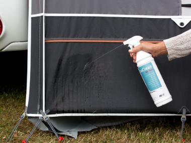 Jeśli twój przedsionek przecieka, problem można zwykle naprawić za pomocą specjalnego sprayu impregnującego AquaTex.