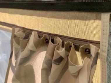 Podczas rozkładania przedsionka ważne jest użycie naszytych pasków regulacyjnych na dwóch nóżkach narożnych i nóżce środkowej.