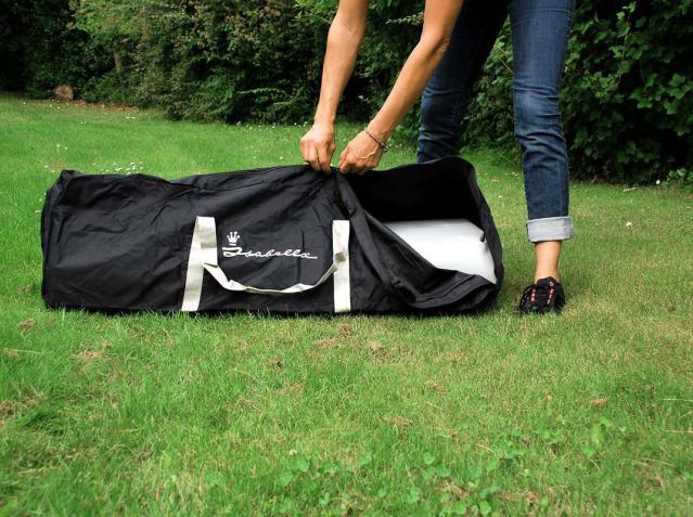 Najlepiej ułożyć go wewnętrzną stroną do góry, aby chronić powłokę zewnętrzną. Złóż front i boki do środka, następnie złóż od jednej strony w sekcjach i na końcu zwiń od przodu – tak, aby lamówka przedsionka znalazła się na zewnątrz rulonu.