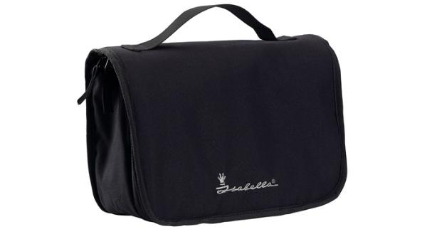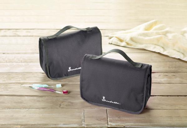 Torbę można zawiesić. Ma wodoszczelny zamek błyskawiczny i mnóstwo kieszeni na przybory toaletowe.