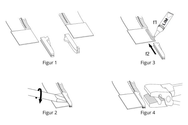 - Nałóż klej kontaktowy w miejscu, gdzie ma znaleźć się nowy ogranicznik (f1), i wsun go na miejsce (f2) (zobacz figur 3).