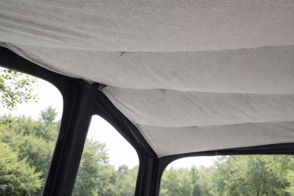 Wszystkie modele Ventura AIR od roku 2026 są wyposażone w pierścienie w suficie, do których podsufitkę można łatwo przymocować za pomocą zaczepów. W tylnych narożnikach znajdują się dwa regulatory, umożliwiające precyzyjne dopasowanie napięcia tkaniny. Dodatkowo podsufitka dachowa jest wyposażona w taśmy wokół centralnej tuby powietrznej, co zapewnia lepsze dopasowanie i pozwala rozłożyć podsufitkę dachową jak najdalej do krawędzi. Trzy wszyte zamki błyskawiczne umożliwiają łatwy dostęp do pierścieni w suficie, dzięki czemu możesz zawiesić przewód oświetleniowy i ustawić oświetlenie dokładnie tam, gdzie najbardziej Ci odpowiada.