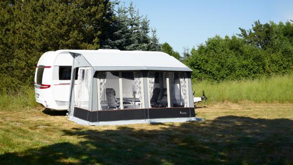 Dwa maszty nosne dociskaja bezpiecznie wszyte piankowe podkladki do boku przyczepy, a profile zatrzaskowe utrzymuja boki bezposrednio na maszcie podtrzymujacym, zapewniajac doskonale uszczelnienie. Model Universal 360 i 420 Dawn maja drzwi po obu stronach i duze okna z przodu, co zapewnia dobry widok. Mocny stalowy stelaz Zinox zapewnia dobra stabilnosc.